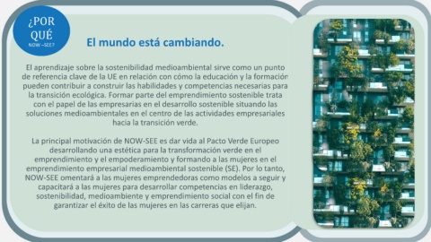 La principal motivación de NOW-SEE es dar vida al Pacto Verde Europeo