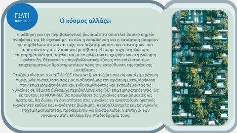 Το κύριο κίνητρο του NOW-SEE είναι να ζωντανέψει την ευρωπαϊκή πράσινη